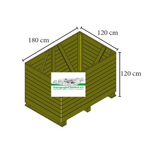 Find kartoffelkasser hos Grønagergård Savværk. Denne rummelige kartoffelkasse måler 120 x 180 x 100/120 cm (B x L x H) og har afrundede kanter. Tegningen i galleriet viser den store med højde på 120 cm, mens billedet er af den lave model med en højde på 100 cm.
